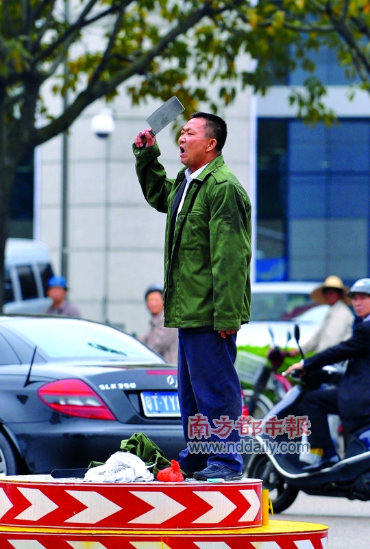 男子赶走交警指挥车辆昨日上午9时许,中山市政府门前兴中大道十字路口岗亭中央的交通指挥台上的交警,被一名手持菜刀的男子驱赶下来,附近巡警很快赶来,围在指挥台附近。男子数次向试图靠近的警察挥刀,将警察逼退之后,再次站上指挥台。“占领”制高点之后,男子脱掉了身上的衣服,然后套上一件草黄色外套。