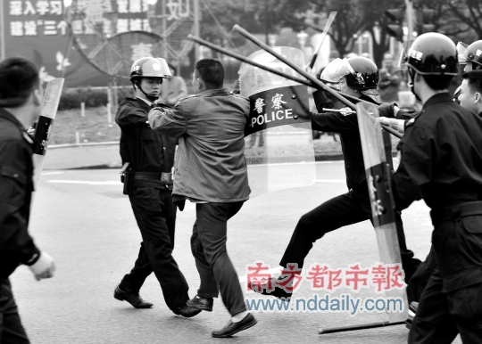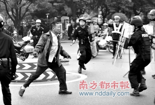 10分钟后,中山市公安局特警和防暴警察赶到,十余位手持盾牌和警棍的防暴警察,站成一排向男子所占的指挥台推进,一名特警将微型冲锋枪抓在手上,站在了防暴警察的身后。男子马上从上衣口袋掏出一把钉锤,紧紧攥在左手,菜刀举在右手,与盾牌阵对峙。