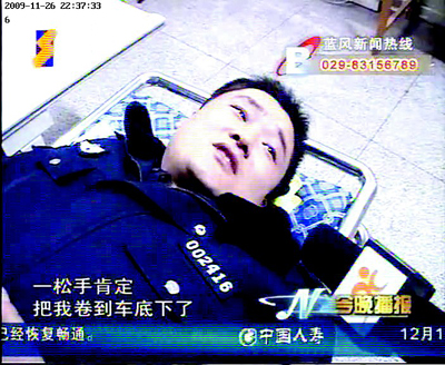 由于受伤的交警是在左前门的位置被拖行,而监控录象在车的右边,所以没有拍到民警的画面,但从警方提供的监控画面可以看到,这辆车牌号为陕VA8866的本田越野车拖着交警快速通过十字路口后,其他交警和警车赶紧追了上去。