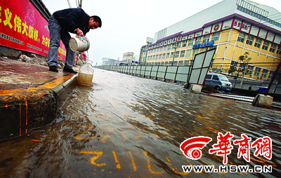 水管里的自来水不断涌出,行人和车辆在水中 行进 本报记者 王警摄