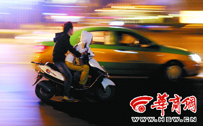 昨晚9时许,一对青年男女身着秋装骑摩托从南门外经过实习记者雷佳摄