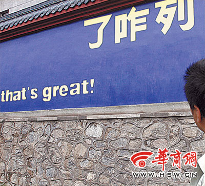 这三幅广告中的陕西方言虽然很有特色,但字词和译文有差错,您看出来了吗?本报记者 张杰 摄影报道