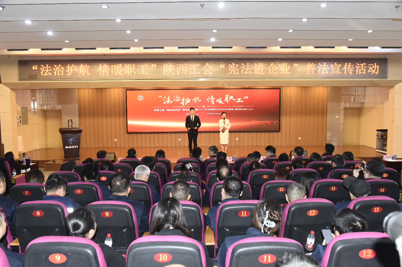 陕工网讯 12月4日,第十二个国家宪法日当天,由陕西省总工会主办,省机械冶金建材工会、宝鸡市总工会协办的“法治护航·情暖职工”陕西工会“宪法进企业”普法宣传活动在宝钛集团宝钛宾馆七楼学术报告厅举行。